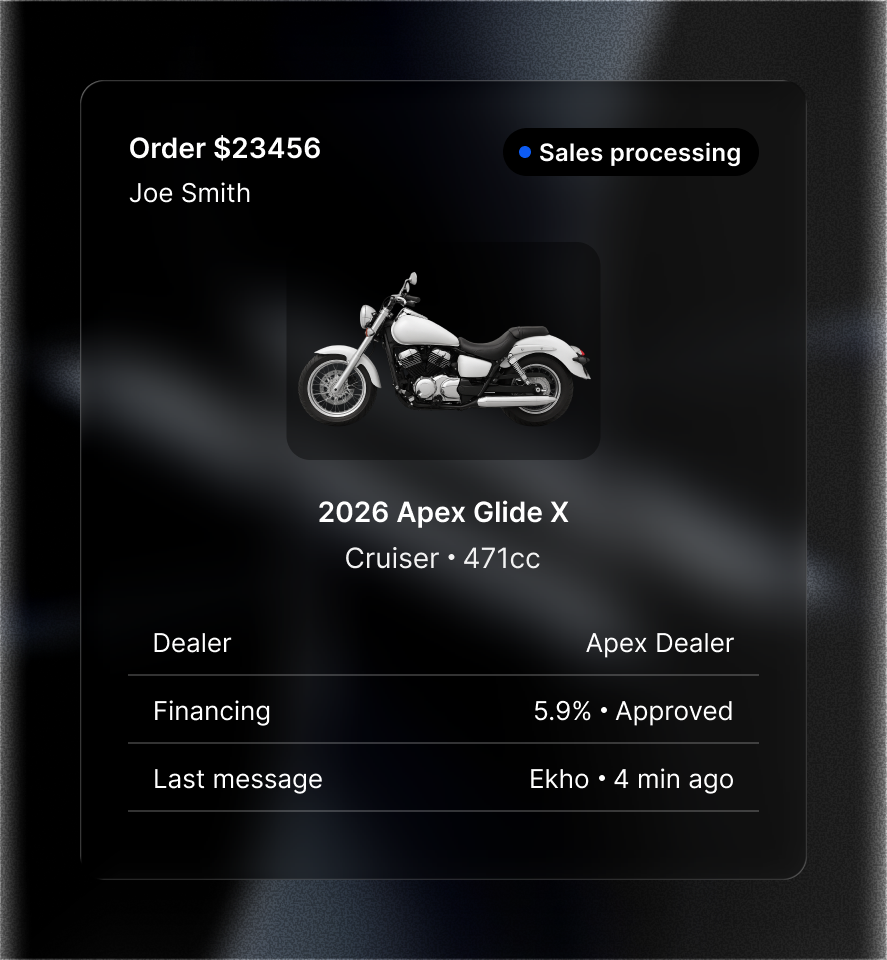 Ekho is the all-in-one platform for dealerships and OEMs — AI agents that sell 24/7, websites that convert, and a transaction engine that handles everything from financing to registration. In all 50 states.